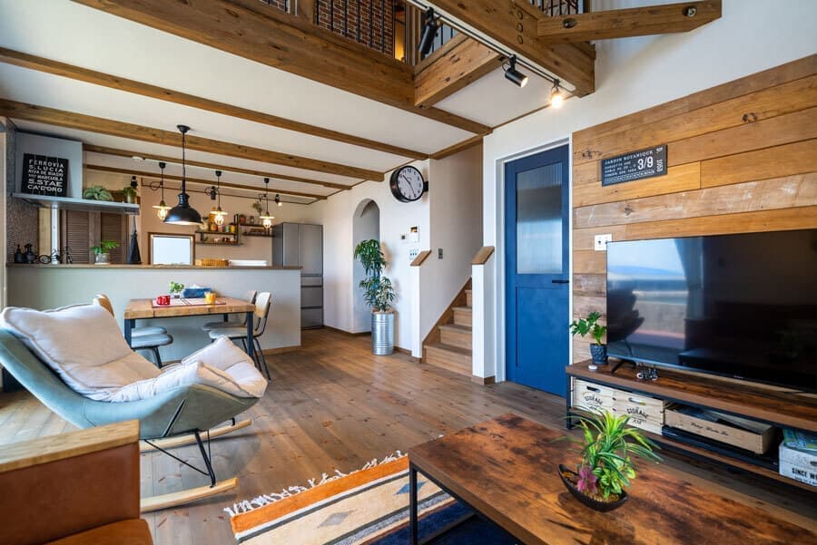 珪藻⼟壁という⾃然素材をベースにし、リビングには古材のアクセントウォール、