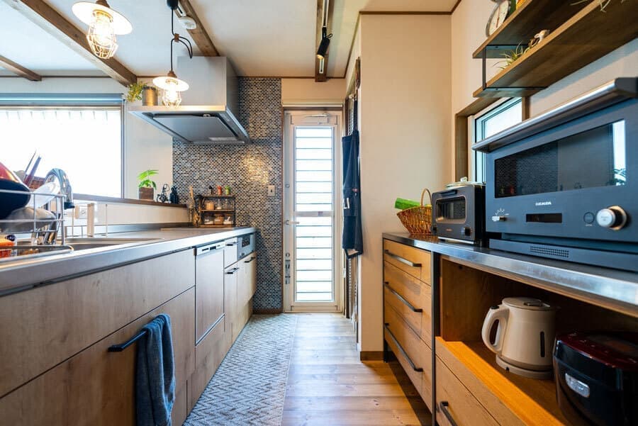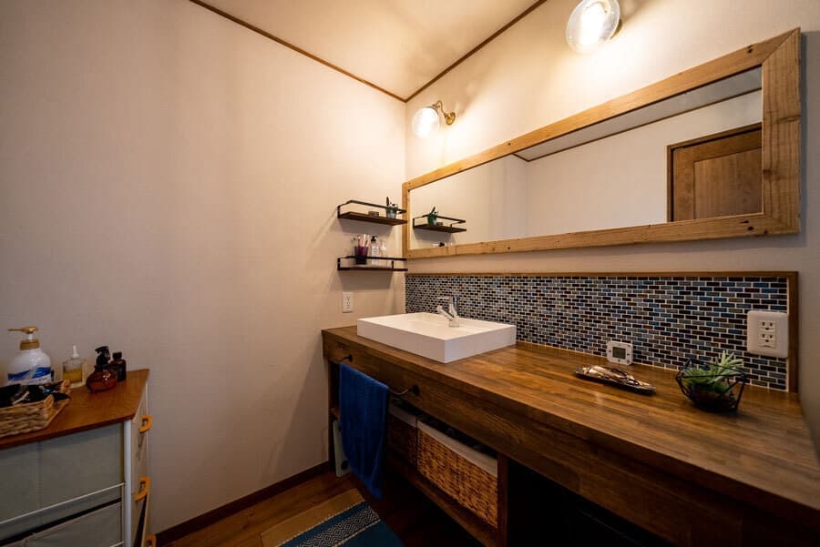 キッチンや洗⾯台の壁にはシックなモザイクタイルをプラス。