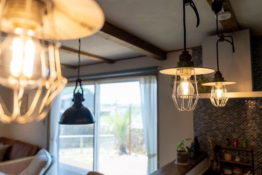 随所で存在感を放つインダストリアルな照明は、すべてH様が探し出してきた。